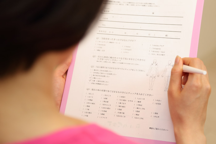 お客様のお悩みや悩みの原因を分析しよりよいサービスができるように問診票へのご記入をお願いをしております。